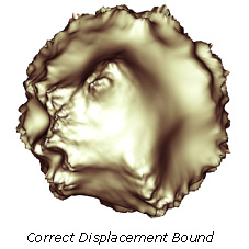 All objects have a bounding box associated with them. This bounding box determines when the object is loaded into memory by the renderer, and it is usually tightly bound to the object in question. However, displaced geometry can be pushed outside of that box, and RenderMan doesn't pay any attention to an object until it reaches a pixel inside an object's bounding box, so things that are displaced out of the box will get missed, leaving large holes in the object. The following images show the artifacts associated with poorly set displacement bounds:
