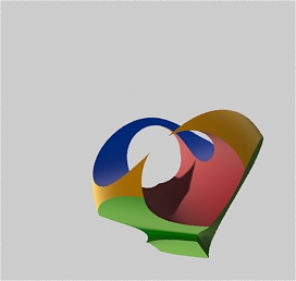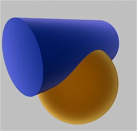 Finally, use the third operator by changing the type to Union Render. A single object is created from the intersecting objects. Note: These two pieces of geometry are now "fused" together into one piece. This can be useful in cases where the fused geometry will be used to perform other CSG operations on other geometry. |