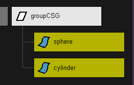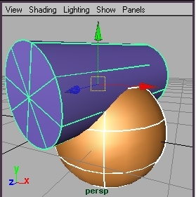 First create two pieces of geometry in Maya, as seen here. (For best results the geometry should be a closed solid, with no open holes.) Next designate each geometric piece as a CSG primitve. Select the geometry (not the Shape node) and then from the Attributes menu, in the Attribute Editor Attributes-> RenderMan-> Add CSG Solid Type This will add a dropdown menu to the Extra RenderMan Attributes. The objects at the base of a CSG hierarchy should always