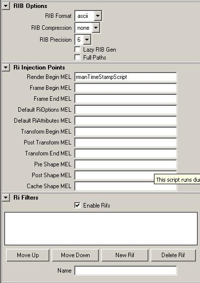 RenderMan for Maya Pro includes additional controls under the Advanced tab, including a dropdown menu to choose between ASCII and binary RIB formats, compression, and precision, a checkbox to enable lazy RIB generation (unchanged textures, shaders, and/or archives are not regenerated), use of fully-qualified paths in RIB files, entry point specifications for Ri for MEL scripts, and an interface for creating and managing Ri Filters.
