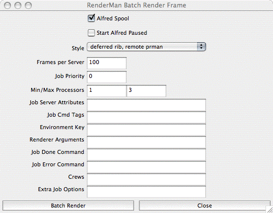 The RenderMan Batch Render Frame window offers you with a simple interface for controlling Alfred's distribution of your renders. To enable Alfred to distribute your batch renders, click the Alfred Spool checkbox (if this is unchecked, the Maya batch mechanism is used, even if you are using RenderMan as your renderer).