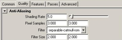 One of the most important things to remember about the Shading Rate is that it is an Attribute. That is, it can be set globally or it can be changed from one primitive to the next. So if you have a finely patterned vase sitting in a room with flat white walls, the vase can have a small shading rate (like 1.0) to capture its detail while the walls can have a very large shading rate (like 64.0) to save time (with no undesired artifacts). Per-object Shading Rates are a very powerful technique that can be used to tell the renderer how much time to spend on individual objects.Pixel Samples: Pixar's RenderMan provides advanced control over antialiasing, and "Pixel Samples" is used to control the amount of super-sampling around a pixel. For speed, this can be set to zero, with the expected loss of image quality. "Pixel Samples" controls hidden-surface antialiasing (which eliminates "jaggies") and low values (e.g. 1x1) can benefit both speed and memory use. Values of 4x4 and up are considered high quality values.