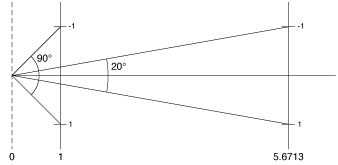 The perspective projection can take one optional argument which is the field of view. This parameter is very similar to the screen window, and is therefore a bit confusing. The perspective field of view moves the screen plane toward or away from the camera, so that the square which falls between (-1,1,-1,1) in screen coordinates covers the specified angle, as seen from the camera. For example, by default the field of view is 90 degrees, and thanks to trigonometry this means the screen plane is 1.0 units in front of the camera. If you were to specify a field of view of 20 degrees, the screen plane would be moved back to 5.6713 units away (1.0/tan(10.0)).