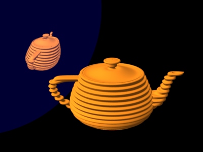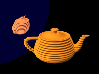 An important thing to consider is that even though displacement mapping is necessary for an object, it is often sufficient to use a bump mapped version for reflections of that object. It is faster to ray trace bump-mapped objects than displacement-mapped objects, so use ray traced displacement only when necessary. Below is shown an example where bump mapping is sufficient. In the image to the left, the reflection of the teapot is displacement mapped. In the image to the right, the reflection of the teapot is bump mapped. There is hardly any visual difference between the images.