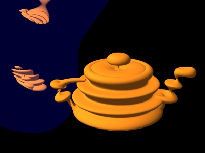 Another way to artistically manipulate ray traced reflections and refractions (without changing the objects themselves) is to twist the reflection directions. Twisting is done by simply adding a vector to some of the computed reflection directions (and renormalizing the direction) before calling trace or gather. Here is an example of a twisted reflection shader