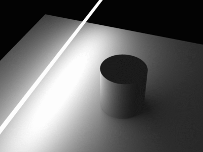 The linear light gives soft shadows in one direction, while the spherical light gives soft shadows in all directions. Note how the shadows are sharp near the cylinder and get blurrier further away.