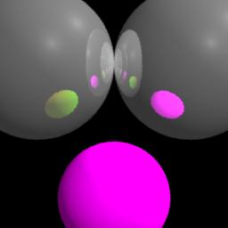 The shader on the lower ball changes how it appears in the reflections from the two upper balls by examining the label strings on the reflection rays. |