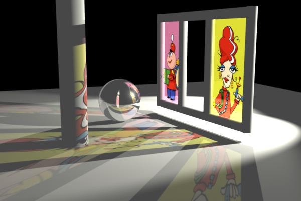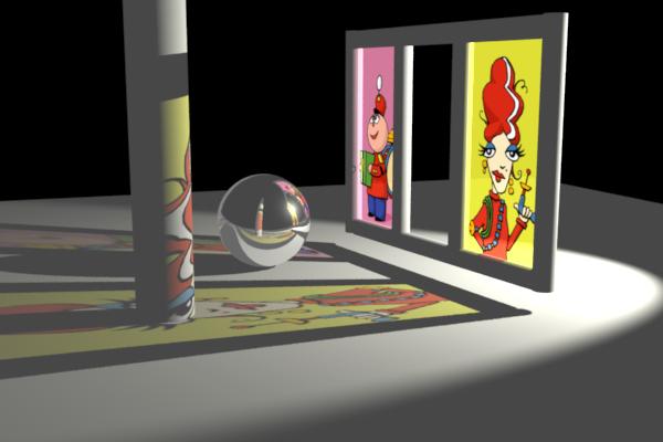 The images below show some examples of twisted reflections. The scene consists of a reflective sphere and two textured squares. In the first image, the sphere has plain reflection without any twist. The second image has the reflection directions twisted in the direction (1,0,-1), making the reflection of the little "Tinny" square appear larger. The third image has the reflection directions twisted down by (0,-1,0), making the reflection of the horizontal "Irma" plane appear larger.