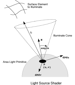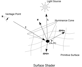 The geometry is characterized by the surface position P which is a function of the surface parameters (u,v). The rate of change of surface parameters are available as (du,dv). The parametric derivatives of position are also available as dPdu and dPdv. The actual change in position between points on the surface is given by P(u+du)=P+dPdu*du and P(v+dv)=P+dPdv*dv. The calculated geometric normal perpendicular to the tangent plane at P is Ng. The shading normal N is initially set equal to Ng unless normals are explicitly provided with the geometric primitive. The shading normal can be changed freely; the geometric normal is automatically recalculated by the renderer when P changes, and cannot be changed by shaders. The texture coordinates are available as (s,t). Figure 12.1 shows a small surface element and its associated state.