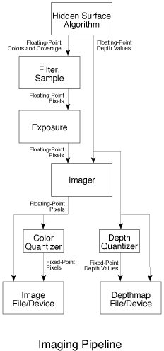 The viewing transformation specifies the coordinate transformations involved with imaging the scene onto an image plane and sampling that image at integer locations to form a raster of pixel values. A few of these procedures set display parameters such as resolution and pixel aspect ratio. If the rendering program is designed to output to a particular display device these parameters are initialized in advance. Explicitly setting these makes the specification of an image more device dependent and should only be used if necessary. The defaults given in the Camera Options table characterize a hypothetical framebuffer and are the defaults for picture files.