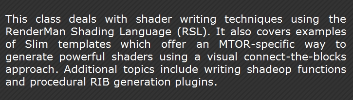 The course begins with an overview of RMan/shading and a quick intro' to RSL, RenderMan's shading language. The next couple of classes deal with a variety of examples of surface, displacement and light shaders and also discuss 'shadeops'. Class #4 presents global illumination shaders and Slim templates. The final class has to do with Slim MEL commands, procedural RIB generation and other misc. topics.