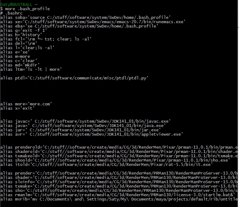You only have to set this file up once (you'll probably keep adding aliases to it on an ongoing basis). From then on, you can simply type the aliased name instead of the longer version (eg. 'prender' below, to run prman). This saves a lot of error-prone, tedious typing.